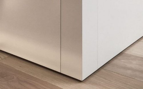 Плинтус практически невидим, так как монтируется в специальный профиль, утопленный в стену, а декоративная планка устанавливается вровень с поверхностью стены. В результате создается ощущение единой, ровной поверхности от стены к полу без переходов и выступов, что делает интерьер более аккуратным и современным.